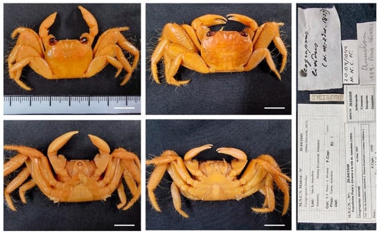 - Rathbun, M.J. The brachyuran crabs collected by the American Museum Congo Expedition, 1909–1915. In Scientific Results of The American Museum Congo Expedition. General Invertebrate Zoology; American Museum of Natural History: New York, NY, USA, 1921. [Google Scholar]