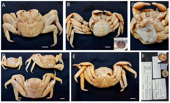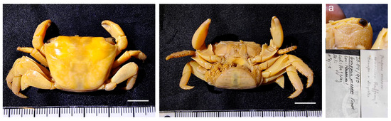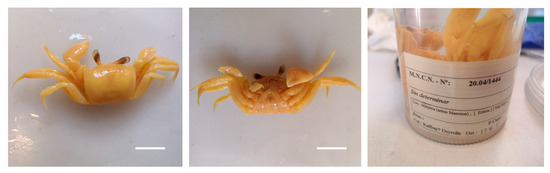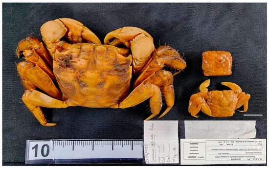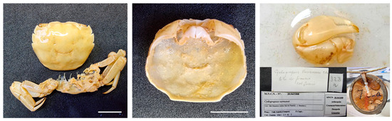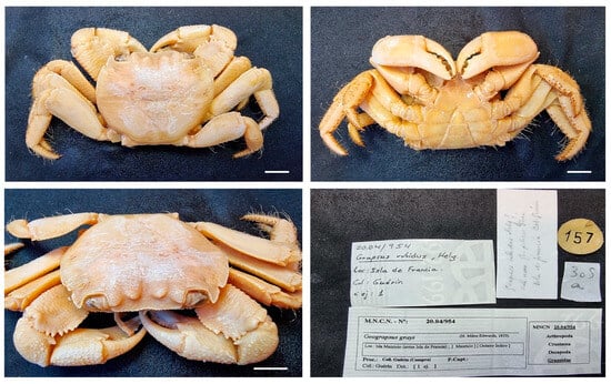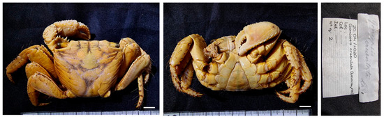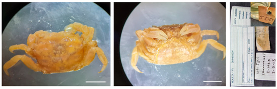 - Ng, P.K.L. Crabs. In FAO Species Identification Guide for Fishery Purposes. The Living Marine Resources of the Western Central Pacific; Carpenter, K.E., Niem, V.H., Eds.; Cephalopods, Crustaceans, Holothurians and Sharks; FAO: Rome, Italy, 1998; Volume 2, pp. 687–1396. [Google Scholar]