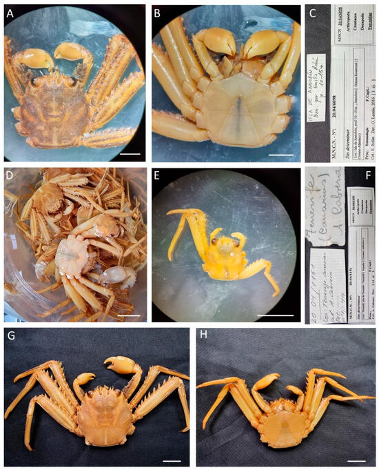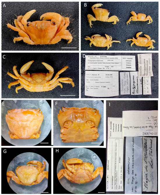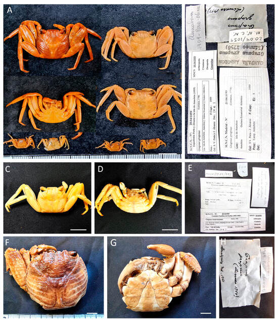 Grapsus adscensionis. (A,B) Specimens from Equatorial Guinea, MNCN 20.04/01059; (C–E) specimen from Cape Vert, MNCN 20.04/00995; (F–H) specimen from Equatorial Guinea, MNCN 20.04/01074. Scale bars: 1 cm.