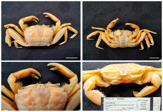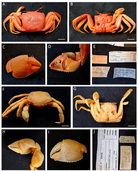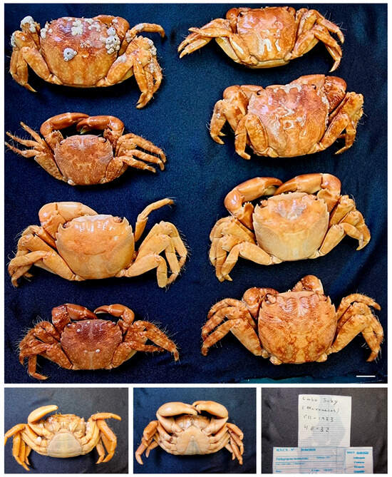 - Capart, A. Crustacés Décapodes Brachyures. In: Expédition océanographique Belge dans les eaux côtières africaines de l’Atlantique Sud (1948–1949). Résultats Sci. Inst. R. Sci. Nat. Belg. 1951, 3, 11–205. [Google Scholar]