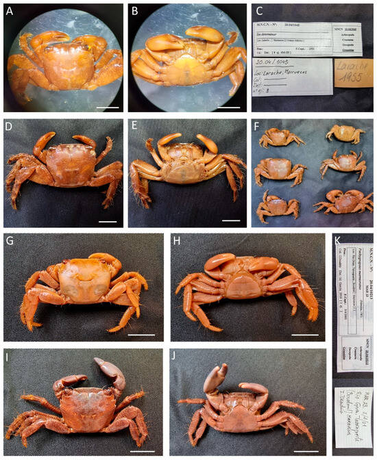- Hsu, J.-W.; Shih, H.-T.; Innocenti, G. A review of the mud crab genus Pseudohelice Sakai, Türkay & Yang, 2006 (Crustacea: Brachyura: Varunidae), with redescription of Cyclograpsus latreillii H. Milne Edwards, 1837, from the western Indian Ocean. Raffles Bull. Zool. 2022, 70, 94107. [Google Scholar] [CrossRef]