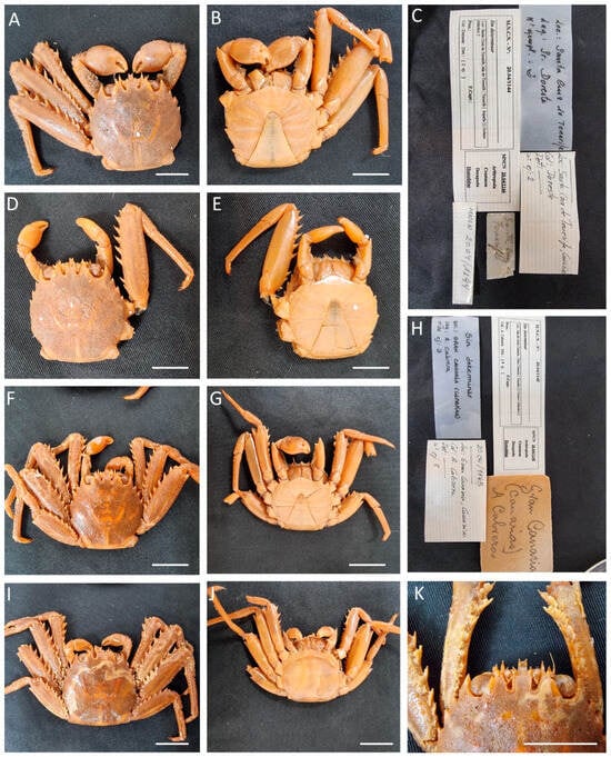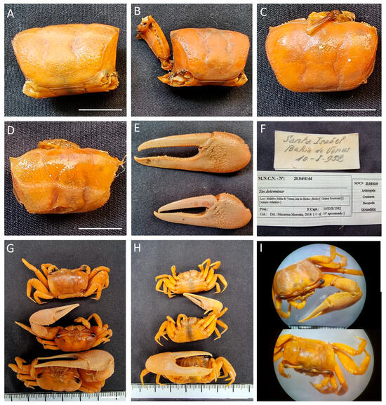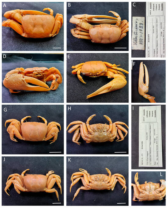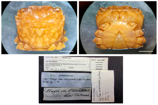 Measurements, given in millimetres (mm), refer to carapace at its maximum width including teeth or spines if present (cw) and carapace length (cl) as length of the dorsal midline from the middle of the frontal region to the posterior margin. In all the measured specimens, the measurement will be given as follows: (cw × cl). In some cases, the identification presented limitations, such as in deteriorated specimens or remains, or in dry specimens where the pleon could not be studied to avoid damaging the specimens, as they are glued to cardboard and displayed in boxes. The term “unsexed” is used to indicate immature specimens or those whose sex cannot be determined. Darwin Core (DwC) terms have been used to cite records and specimens in the Material Examined Section.