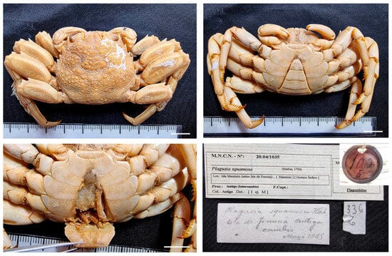 - Schubart, C.D.; Ng, P.K.L. On the identities of the rafting crabs Cancer depressus Fabricius, 1775, Cancer squamosus Herbst, 1790, Plagusia immaculata Lamarck, 1818 (Crustacea: Decapoda: Brachyura: Plagusiidae). Raffles Bull. Zool. 2000, 48, 327–3356. [Google Scholar]