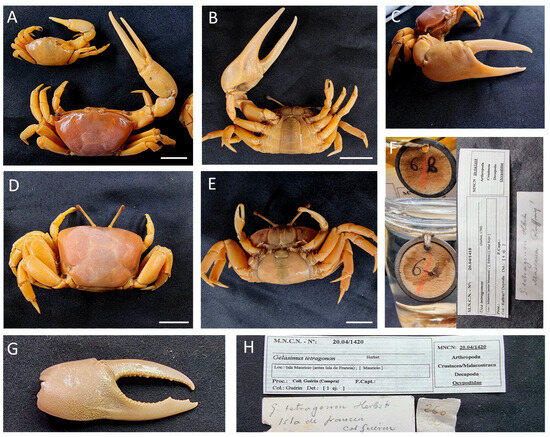 - Crane, J. Fiddler Crabs of the World (Ocypodidae: Genus Uca); Princeton University Press: Princeton, NJ, USA, 1975; pp. 1–736. [Google Scholar]
