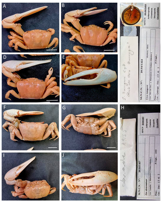 - Muñoz, I.; García-Raso, J.E.; Sánchez Chillón, B.; Cuesta, J.A. Marine crabs from African waters deposited in the MNCN. An opportunity for biogeographic and systematic studies. Part I. Heterotremata. Eur. J. Taxon. 2025, 996, 1–94. [Google Scholar] [CrossRef]