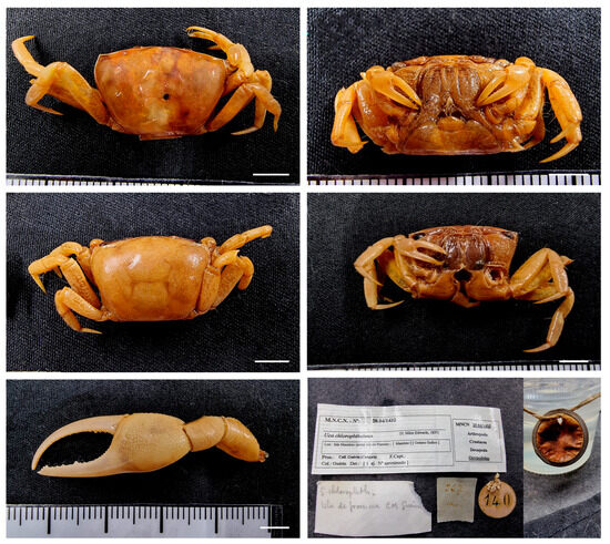 - Shih, H.-T.; Ng, P.; Davie, P.; Schubart, C.; Türkay, M.; Naderloo, R.; Jones, D.; Liu, M.-Y. Systematics of the family Ocypodidae Rafinesque, 1815 (Crustacea: Brachyura), based on phylogenetic relationships, with a reorganization of subfamily rankings and a review of the taxonomic status of Uca Leach, 1814, sensu lato and its subgenera. Raffles Bull. Zool. 2016, 64, 139–175. [Google Scholar]