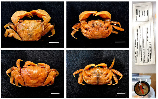 - Schubart, C.D.; Ng, P.K.L. Revision of the intertidal and semiterrestrial crab genera Chiromantes Gistel, 1848, and Pseudosesarma Serène & Soh, 1970 (Crustacea: Brachyura: Sesarmidae), using morphology and molecular phylogenetics, with the establishment of nine new genera and two new species. Raffles Bull. Zool. 2020, 68, 891–994. [Google Scholar] [CrossRef]