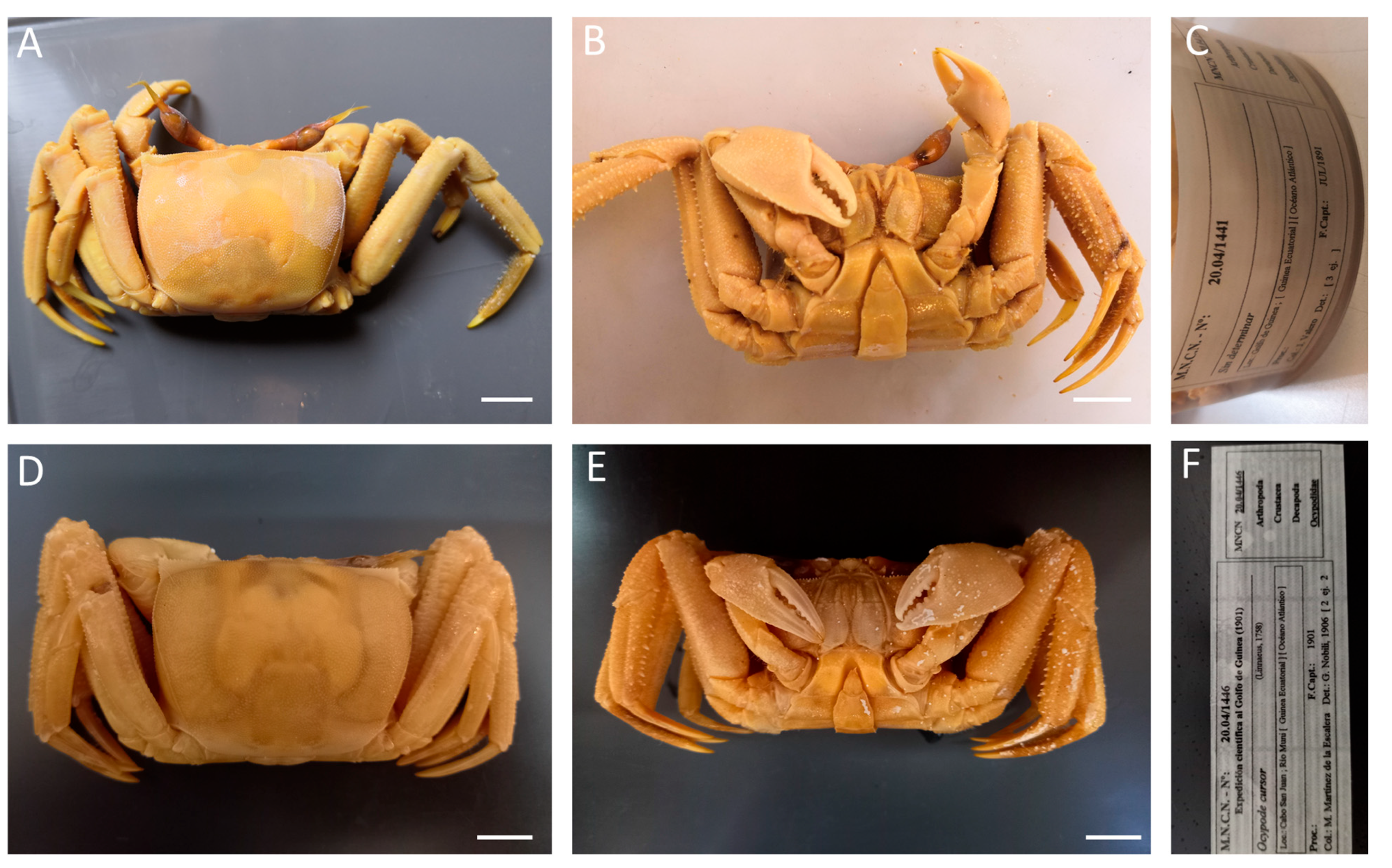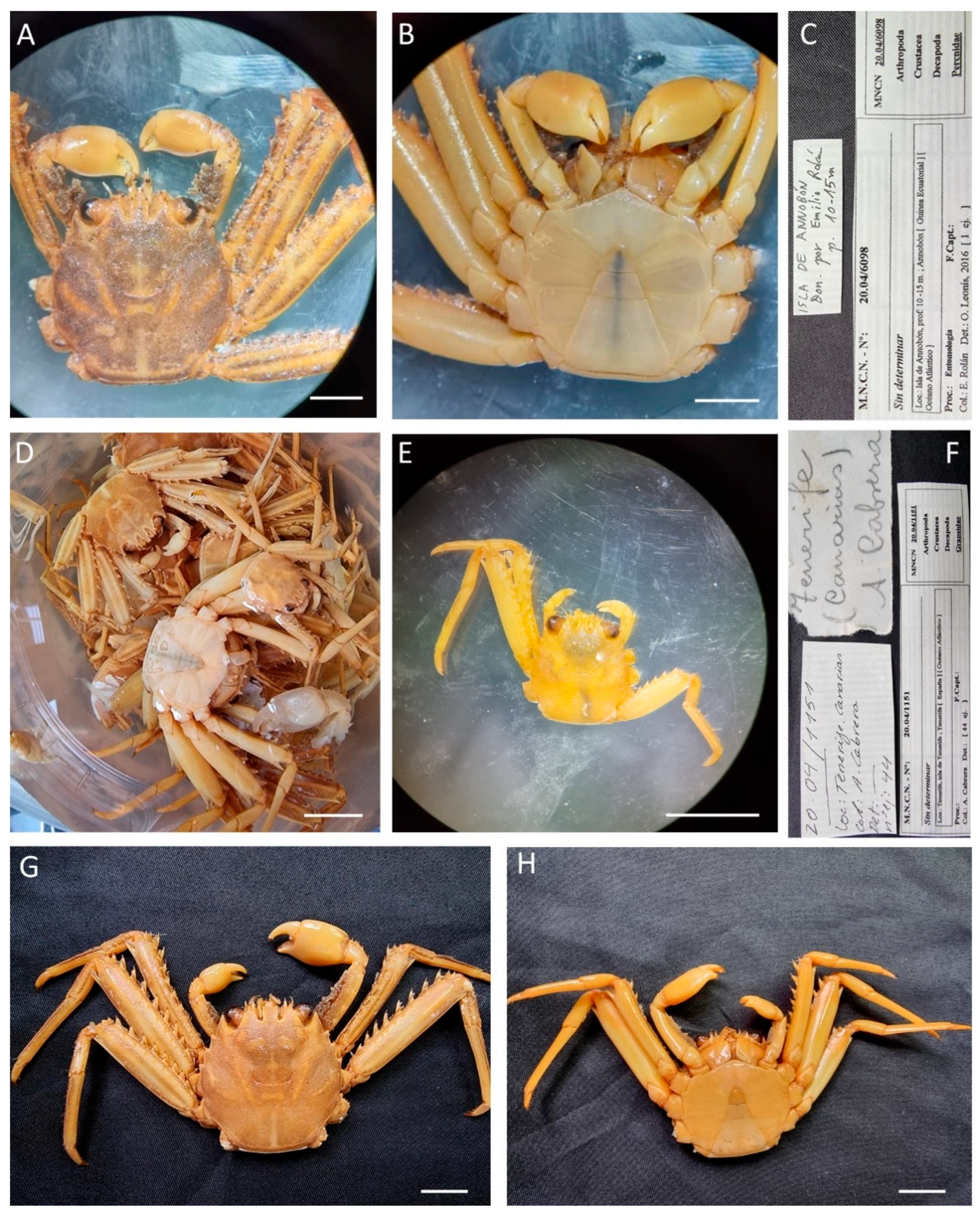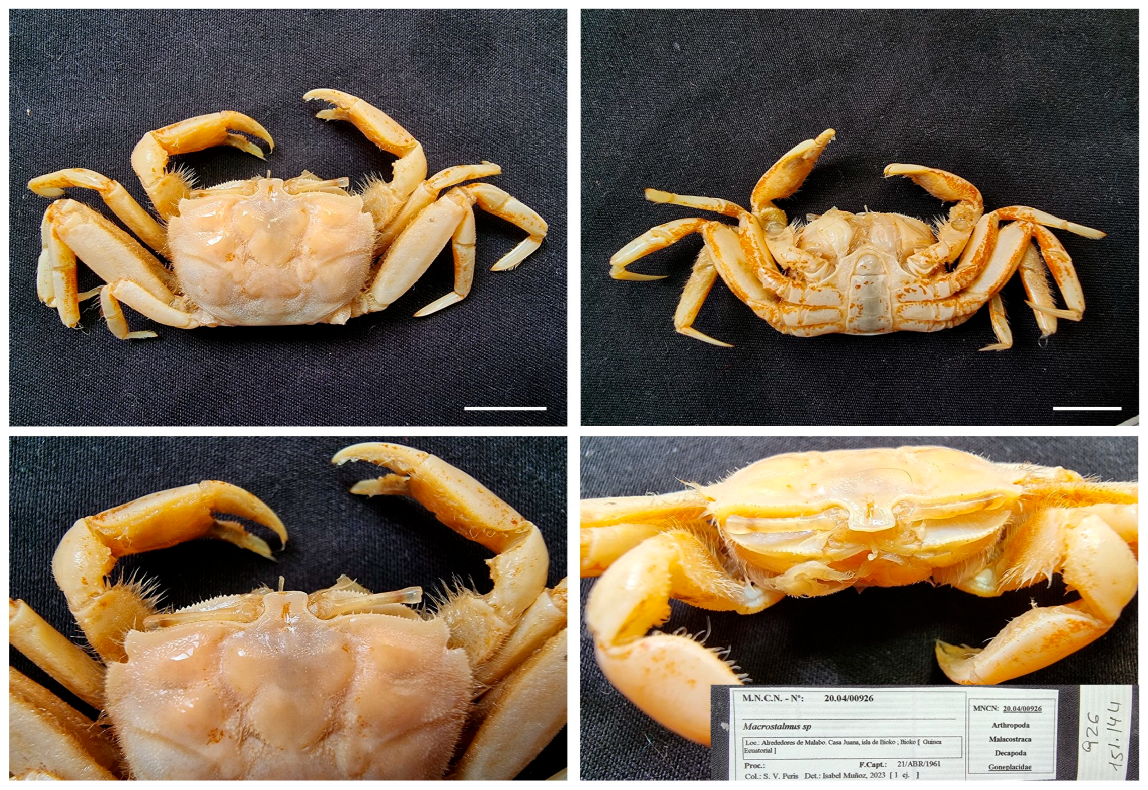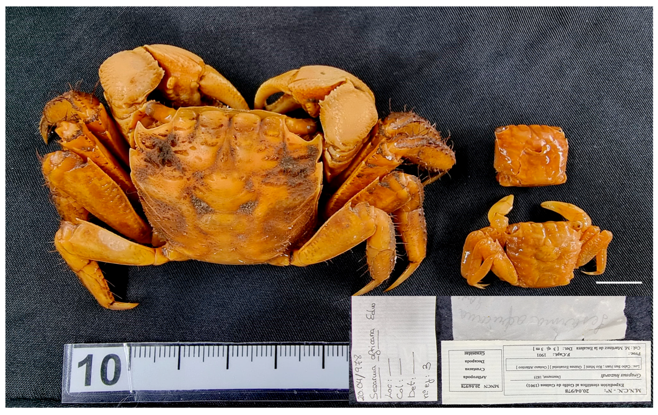 Material examined. EQUATORIAL GUINEA—San Juan Cape • Five unsexed (nor sized, nor sexed); 17 August 1901; M. Martínez de la Escalera leg.; MNCN 20.04/01450. − Annobón Island • Seven ♂♂ (18.6 × 15.2, 20.4 × 15.9, 20.2 × 15.5, 18.7 × 15.6, 22.3 × 17.1, 23.6 × 18.2, 22.7 × 17); 1959; S.V. Peris and J. Álvarez leg.; MNCN 20.04/01475 (not photografied).