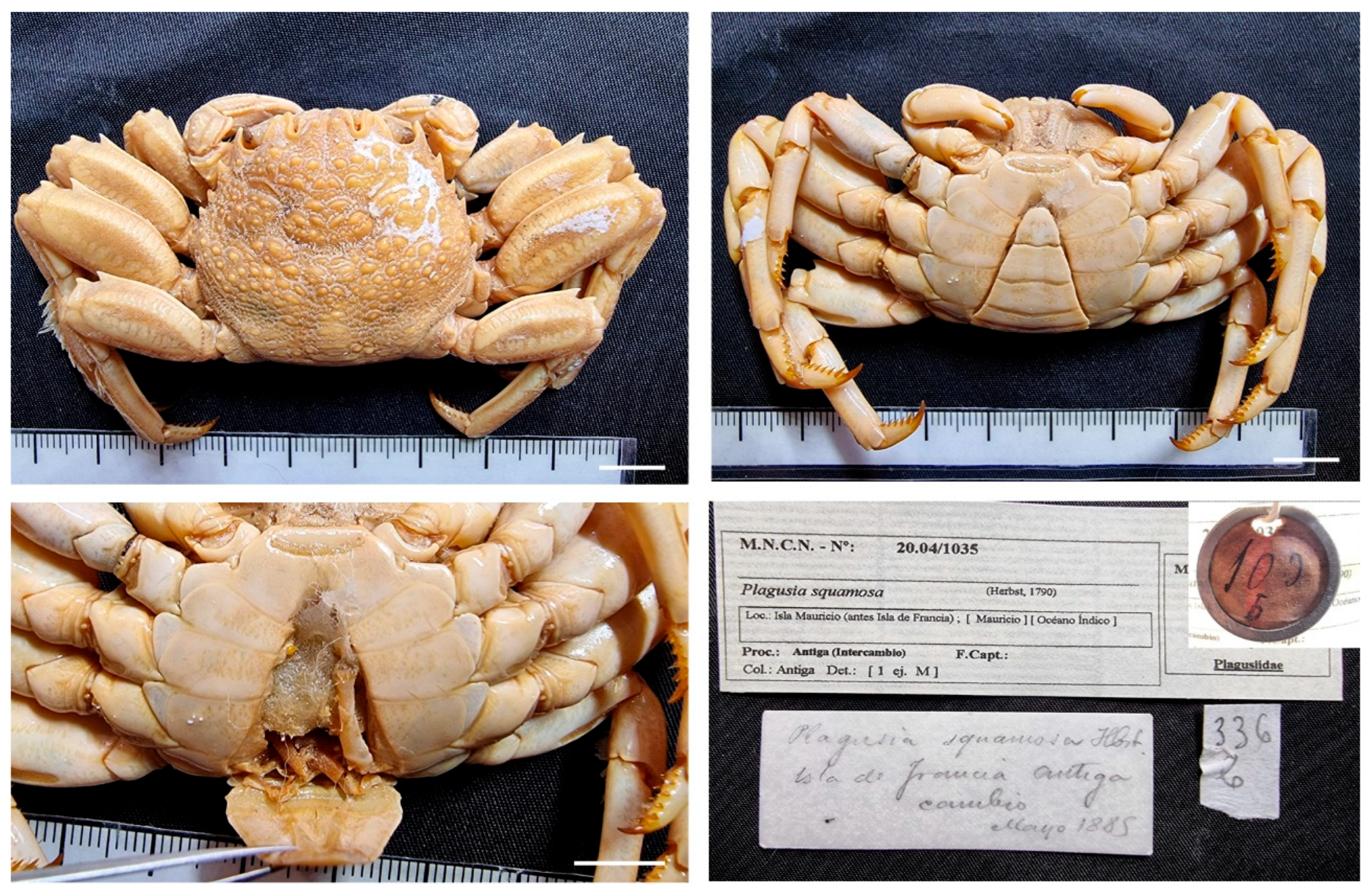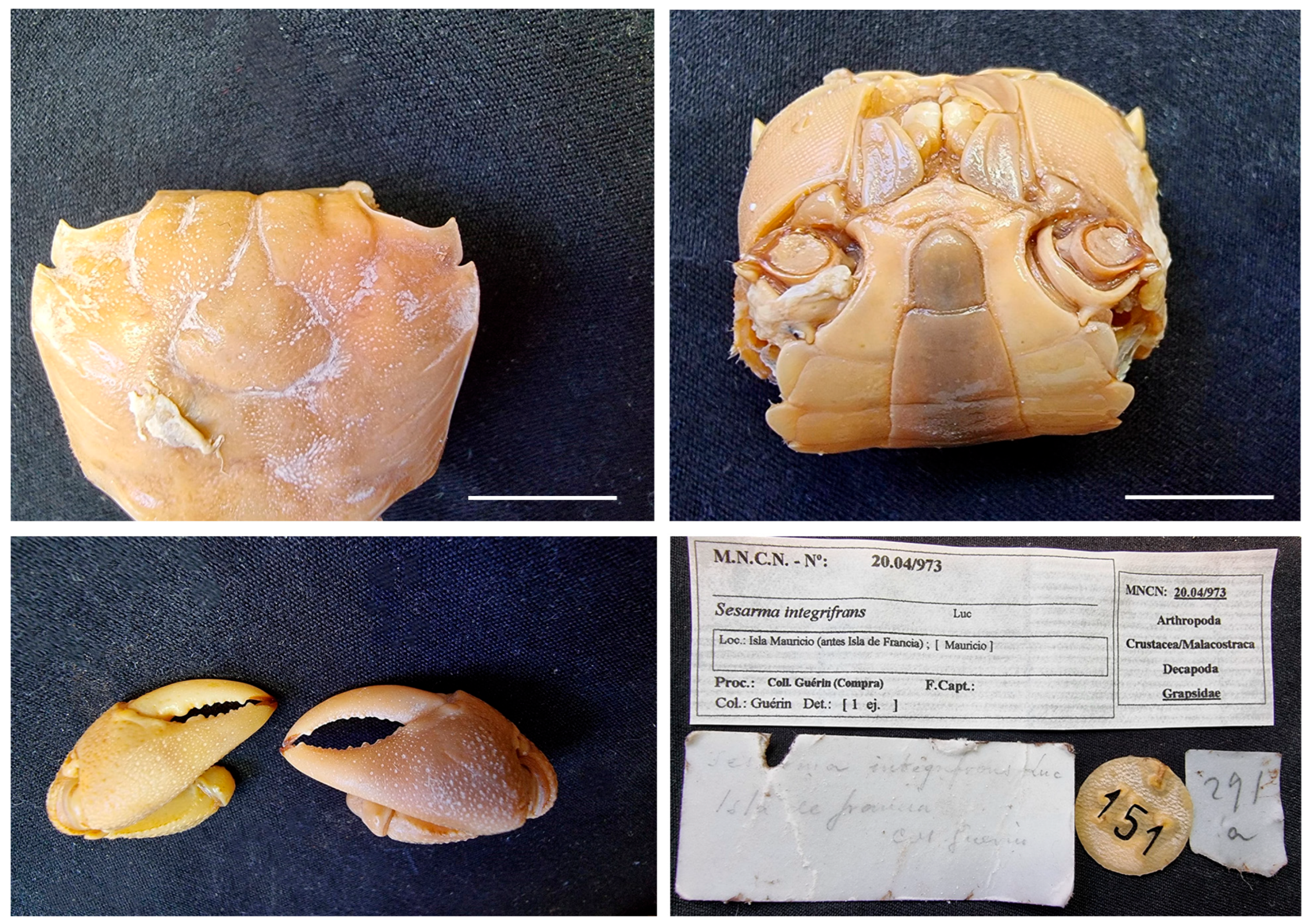 Material examined. MAURITIUS • One ♂ (56.6 × 53.2); May 1885; Antiga leg.; MNCN 20.04/00989 • Three ♂♂ (50.3 × 46.2, 34 × 32.4, 24.8 × 24); 1824?; “La Coquille” corvette; Guérin-Méneville leg.; MNCN 20.04/00993.