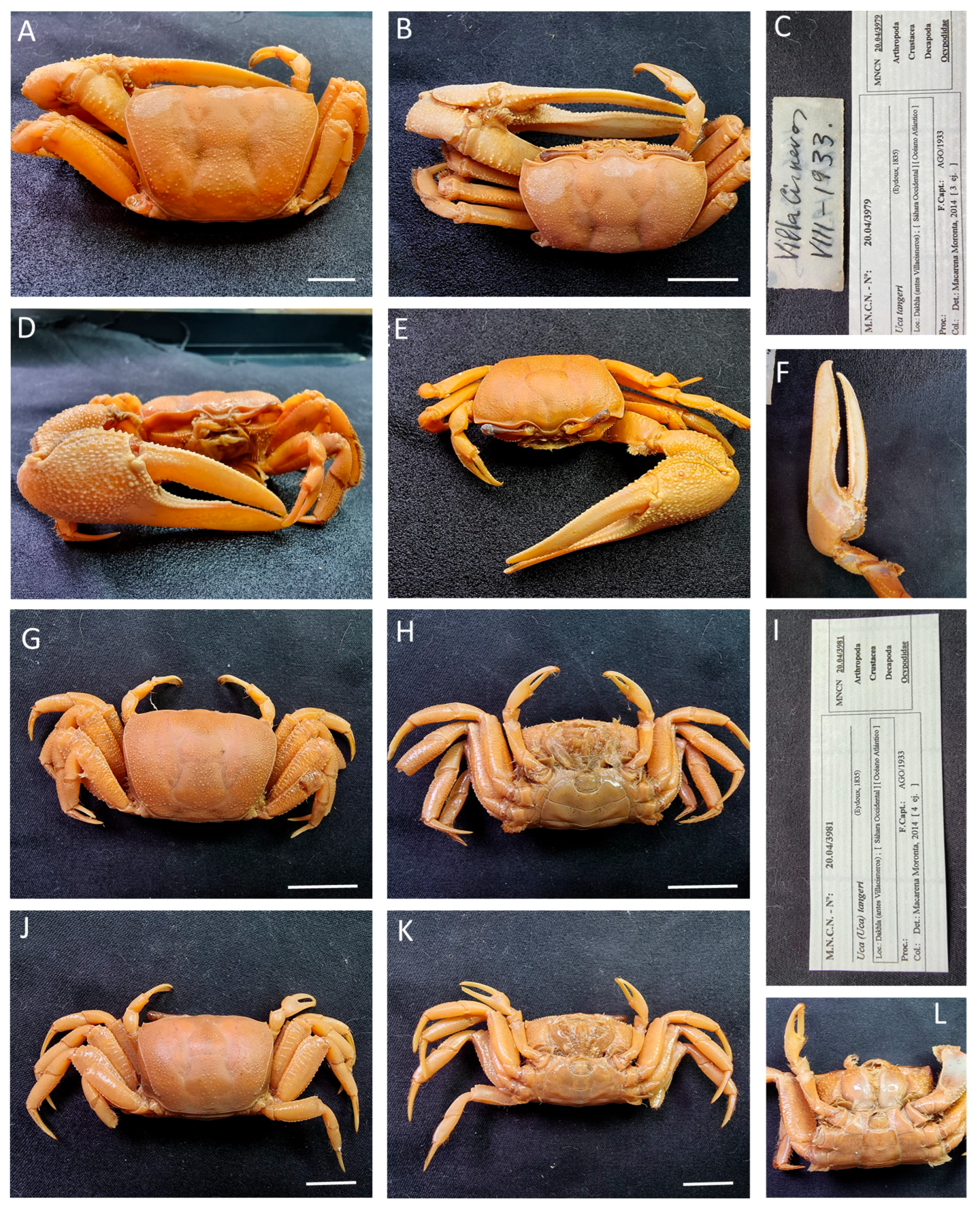 Remarks. The records with codes MNCN 20.04/04144 and MNCN 20.04/01467 came in as “Sin determinar” (undetermined), assigned to Ocypodidae; MNCN 20.04/01411 was identified as Gelasimus platydactilus, actually as Uca major (Herbst, 1782) and with East American distribution, and the rest of the specimens were labelled with the old name, Uca tangeri. The specimens included in record MNCN 20.04/01429 are known to have been collected in the Gulf of Guinea, most likely in Equatorial Guinea, but the current record itself is marked with a question mark.