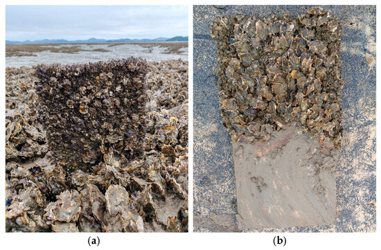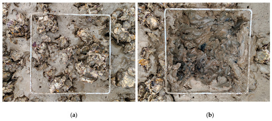 Survey quadrats sized 25 cm × 25 cm before (a) and after (b) oyster collection in the oyster reefs on Magu Island.