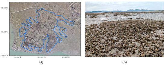 Oyster reefs on Magu Island. (a) Overall distribution (blue line) decided by UAV orthorection technology; (b) Reef-building oysters attached to each other and piled up.