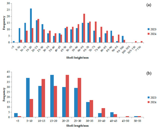 The density of reef-building oysters ranged from 2528.00 ind·m−2 to 3904.00 ind·m−2, with a mean density of 3097.60 ind·m−2 in October 2023 and 3260.80 ind·m−2 in April 2024, respectively (Table 1). However, the mean biomass in Oct. 2023 was higher than that in Apr. 2024. Interestingly, the shell in April 2024 was larger than that in October 2023. Although the mean shell height was comparable, the mean shell length was significantly larger in April 2024 than in October 2023. The largest shell height in 2023 was 97.90 mm, while that in 2024 was 116.30 mm. The frequent distribution of shell height presented two peaks divided by 40 mm in both surveys: 15–20 mm (26 individuals) and 60–70 mm (30 individuals) in October 2023; 20–25 mm (18 individuals) and 60–65 mm (22 individuals) in April 2024 (Figure 3). For shell length, the interval of 15–20 mm had the largest frequency of 42 in 2023 and the interval of 20–25 mm had the largest frequency of 42 in 2024. The top five intervals of shell length for both surveys were from 5–10 mm to 25–30 mm, accounting for 84.0% and 85.5% of individuals in 2023 and 2024, respectively. The largest shell length was 52.40 mm in 2023 and 52.50 mm in 2024. The smallest shell length of only 4.50 mm was found in 2024.