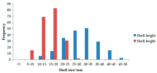 Frequency distributions of shell height and shell length of the recruited oysters.