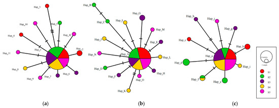TCS networks for the reef-building oyster population on Magu Island based on (a) cox1, (b) cox3, and (c) nad2.