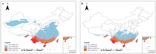 Distribution of the suitability of genus Heliocopris in China under curent climatic conditions. (A) Prediction of the habitat suitability area for the Heliocopris dominus; (B) Prediction of the habitat suitability area for the Heliocopris bucephalus. The habitat suitability areas are represented by different colors: 0.6–0.9 is a high suitability area (red), 0.3–0.6 is a medium suitability area (orange), 0.1–0.3 is a low suitability area (blue), and 0–0.1 is an unsuitable area (white). Note: The map was produced using the standard base map with Review Number GS (2020) 4619, obtained from the Standard Map Service of the Ministry of Natural Resources (http://bzdt.ch.mnr.gov.cn). No alterations were made to the original base map.