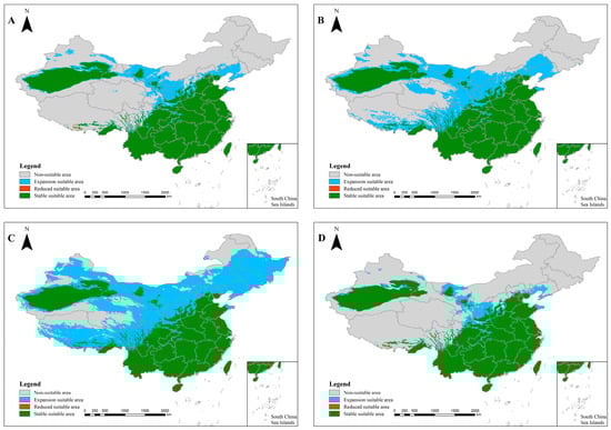 Under the climate scenarios of RCP 2.6 and RCP 8.5 for 2050 and 2070, H. dominus is projected to experience significant northward expansion. In the 2050 RCP 8.5 scenario, the species will show sporadic increases and decreases in northern Tibet and western Chongqing (Figure 3B), with stable areas largely unchanged. For both the 2050 RCP 2.6 and RCP 8.5 scenarios, H. bucephalus is expected to expand predominantly into eastern Sichuan, Guizhou, central and northern Hunan, northern Jiangxi, and Zhejiang, with smaller population increases in Chongqing, Hubei, and Henan. These regions will display considerable variation in expansion and contraction (Figure 4A,B). In the 2070 RCP 2.6 scenario, the species is anticipated to expand into Xinjiang, northern Tibet, and northern Chongqing (Figure 4C).