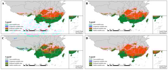 Distribution of the suitability of Heliocopris bucephalus in China under future climatic conditions. (A): 2050 RCP 2.6 scenario; (B): 2050 RCP 8.5 scenario; (C): 2070 RCP 2.6 scenario; (D): 2070 RCP 8.5 scenario. Note: The map was produced using the standard base map with Review Number GS (2020) 4619, obtained from the Standard Map Service of the Ministry of Natural Resources (http://bzdt.ch.mnr.gov.cn). No alterations were made to the original base map.