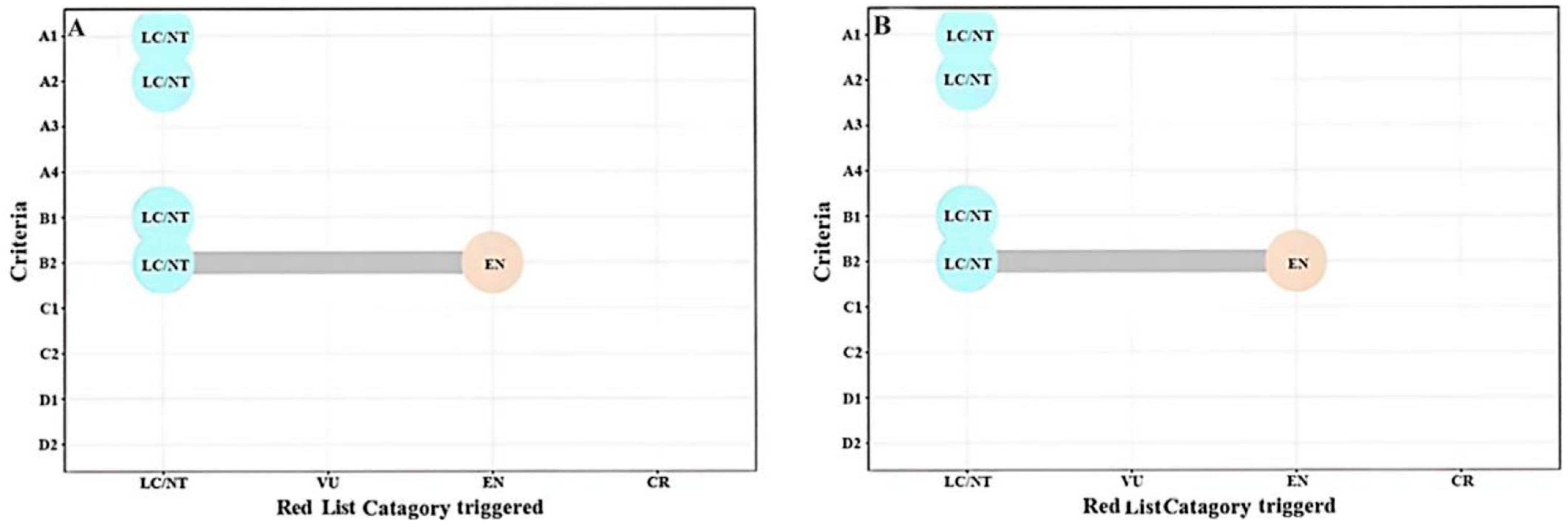 The criteria for assessing the conservation status of endangered species are developed and promoted by the “International Union for Conservation of Nature (IUCN)”. These criteria are designed to evaluate the extinction risk of species based on past, present, and projected future threats, and to classify species into corresponding threat categories within a standardized system. The assessment is based on various threat factors, including population size and trends, number of mature individuals, geographic range, habitat loss or degradation, habitat fragmentation, impacts of climate change, invasive species, overharvesting or poaching, disease or pathogens, environmental pollution, human disturbance, decreased reproductive success, and changes in food chains or ecosystem functions. Specifically, these factors are classified as follows: A1: percentage decline in population size: A2: continuous population decline; A3: predicted future population decline; B1: extent of population distribution; B2: shrinkage or degradation of distribution range; C1: changes in population size; C2: decline in population size and distribution area; D1: reduction in habitat area; D2: decline in habitat quality; E1: predicted impact of climate change and long-term trends; F1: threats posed by invasive species; G1: impact of overhunting or overfishing; H1: impact of diseases on the population; I1: negative impact of pollution on habitats and populations; J1: impact of land reclamation and infrastructure development on species; K1: decline in reproductive success; L1: impact of ecosystem function changes on species. Biodiversity assessments are internationally conducted according to nine categories, namely: extinct (EX), extinct in the wild (EW), regionally extinct (RE), critically endangered (CR), endangered (EN), vulnerable (VU), near threatened (NT), least concern (LC), and data deficient (DD). Among these, the categories critically endangered (CR), endangered (EN), and vulnerable (VU) are collectively referred to as the “Threatened Categories”.