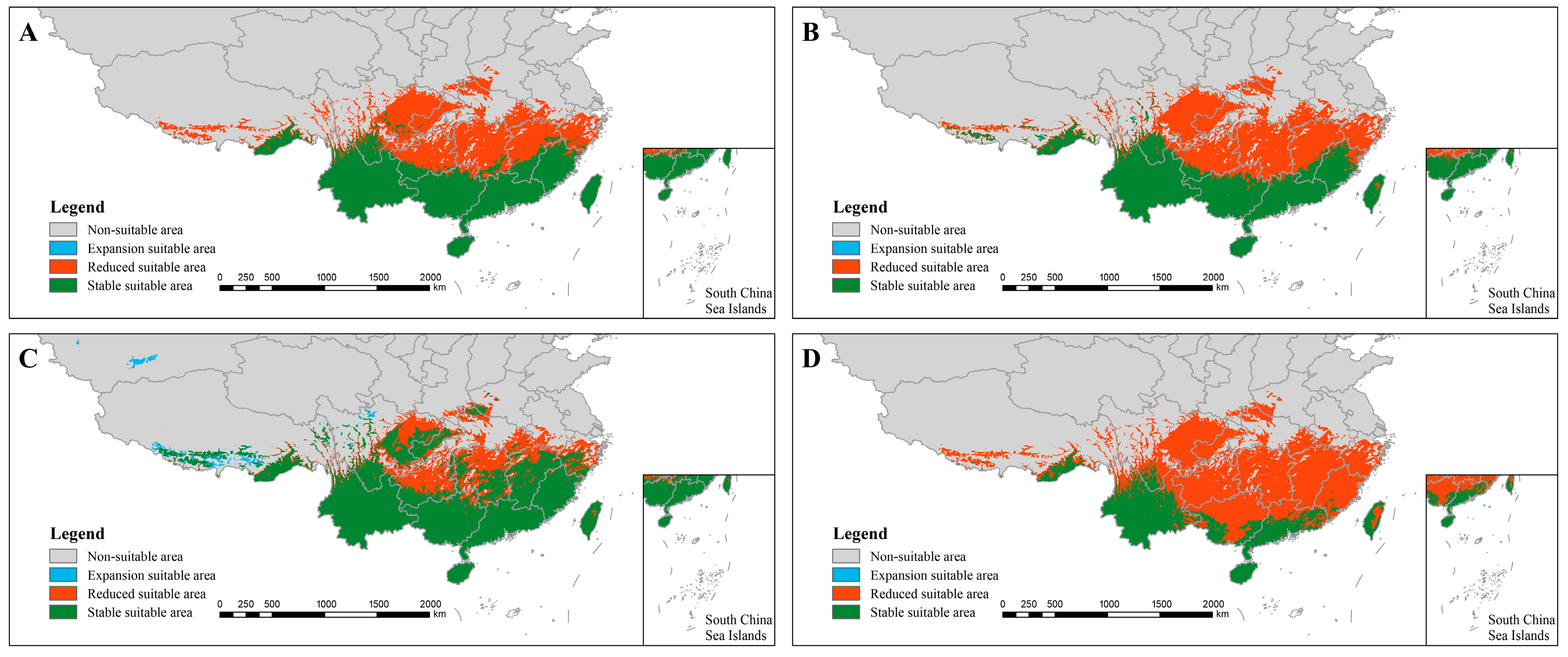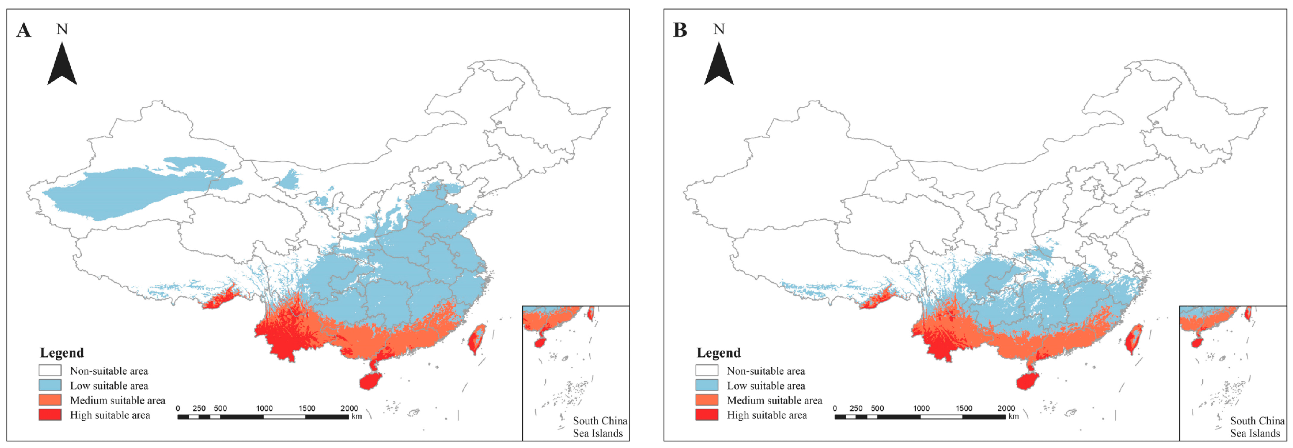35]. The anticipated favorable habitats for the two species roughly correspond with their documented distributions in China, particularly agreeing with verified occurrences in Yunnan and Hainan. Under prevailing climate circumstances, the anticipated habitat suitability for