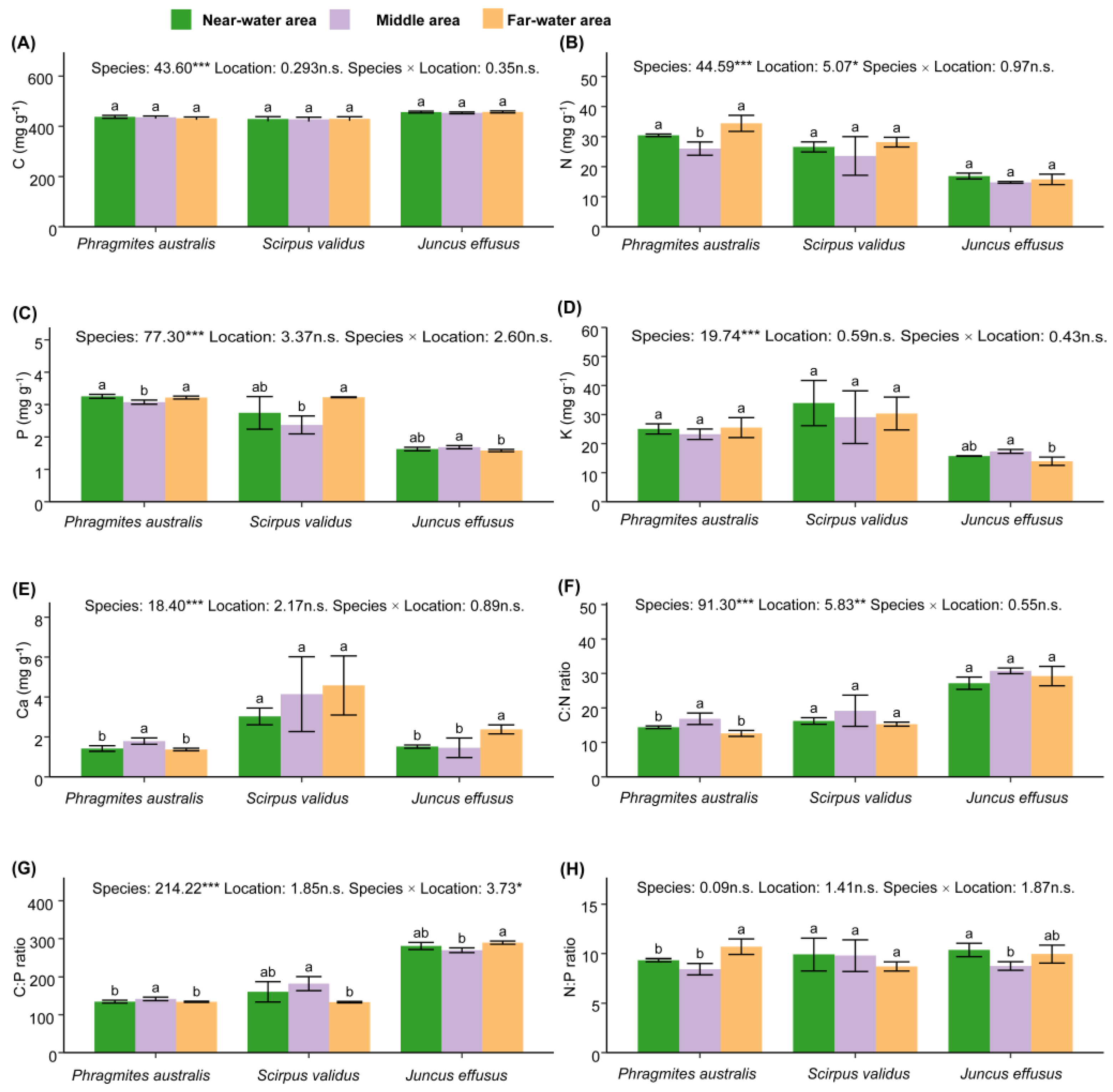 | Species | Nutrients | Near-Water Area (mg g−1) | Middle-Area (mg g−1) | Far-Water Area (mg g−1) |