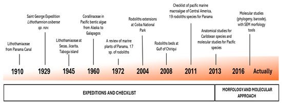 The history of rhodoliths research in Panama dates back more than a century (Figure 1), when in 1910, Marshall Howe ventured into the Isthmus and first documented Corallinaceae species in the Bay of Panama. Although the known marine flora was limited at that time, Howe found rhodoliths in sites such as Isla Taboga, Urava, and Taboguilla, as well as in the Canal Zone [10]. Eight years later, in 1918, Howe returned to the region and reported four species of Lithothamiaceae in the Panama Canal, highlighting the geological significance of his findings, as well as their relevance to fossil species [11].