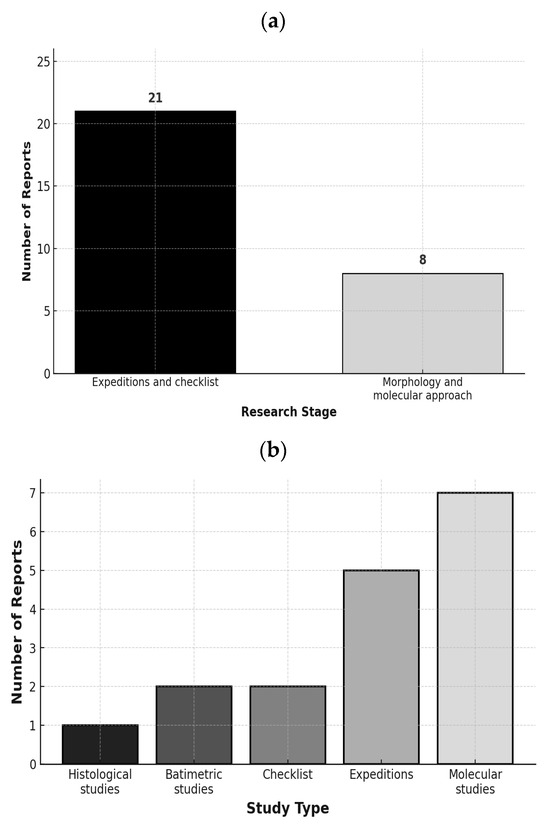 Over the decades, research on rhodoliths in Panama has progressed gradually, with most reports resulting from expeditions and literature reviews (Figure 2a). Each new discovery has shed light on the ecological importance of these calcareous algae, which continue to attract a growing interest in the marine science community. In recent years, the number of publications providing molecular information on Panama’s rhodoliths has been steadily increasing (Figure 2b), further enhancing our understanding of their biological relevance.