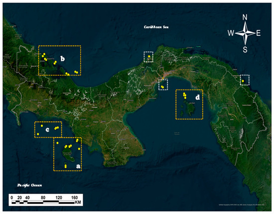 Key areas with important extensions of rhodoliths in Panama: (a) Coiba, (b) Bocas del Toro, (c) Gulf of Chiriqui, and (d) Las Perlas Archipelago. Squares with dotted lines in white represent sites with one or two reports.