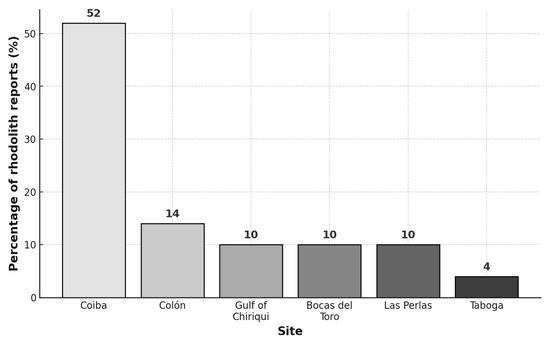 The greatest diversity is found in Panama’s Pacific (Figure 3), with the Coiba National Park standing out as the area with the highest species richness (Figure 4). The vast, sandy and rocky, soft-bottom substrates predominant in PNC provide ideal conditions for the establishment of rhodolith communities, forming extensive beds [9,16].