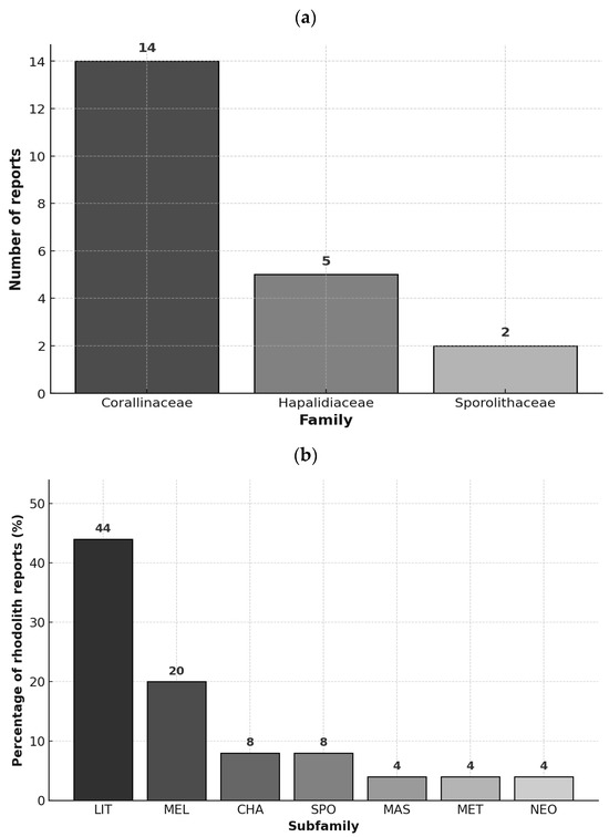 Ten genera of rhodolith-forming species are reported in Panama. Similar to observations by Robinson et al. [34] for the Tropical Eastern Pacific, the order Corallinales dominates the assemblage, accounting for 66.7% of the species (Figure 5a), with the subfamily Lithophylloideae representing 44% (Figure 5b). Within this group, the genus Lithophyllum emerges as the most frequently recorded along Panama’s coasts.