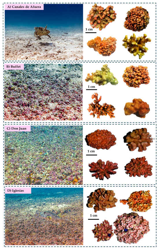 Our surveys confirm the presence of rhodolith beds at the NE of the PNC (Table 3, Figure 6), with coverage ranging between 46% and 69%, depending on the location. The Canales de Afuera exhibited a rhodolith coverage of 46%, while in Buffet, the coverage was 49%, and in Don Juan, it reached 65%. The highest coverage to date was found at Iglesias, with 69% rhodolith coverage.