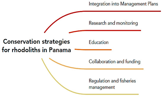 To address these threats, we propose the following conservation strategies based on the Coiba National Park management plan [8] and other documents that refer to frameworks for the study and conservation of rhodoliths in other latitudes [8,34,39,40,49,51,52,53] (Figure 7):