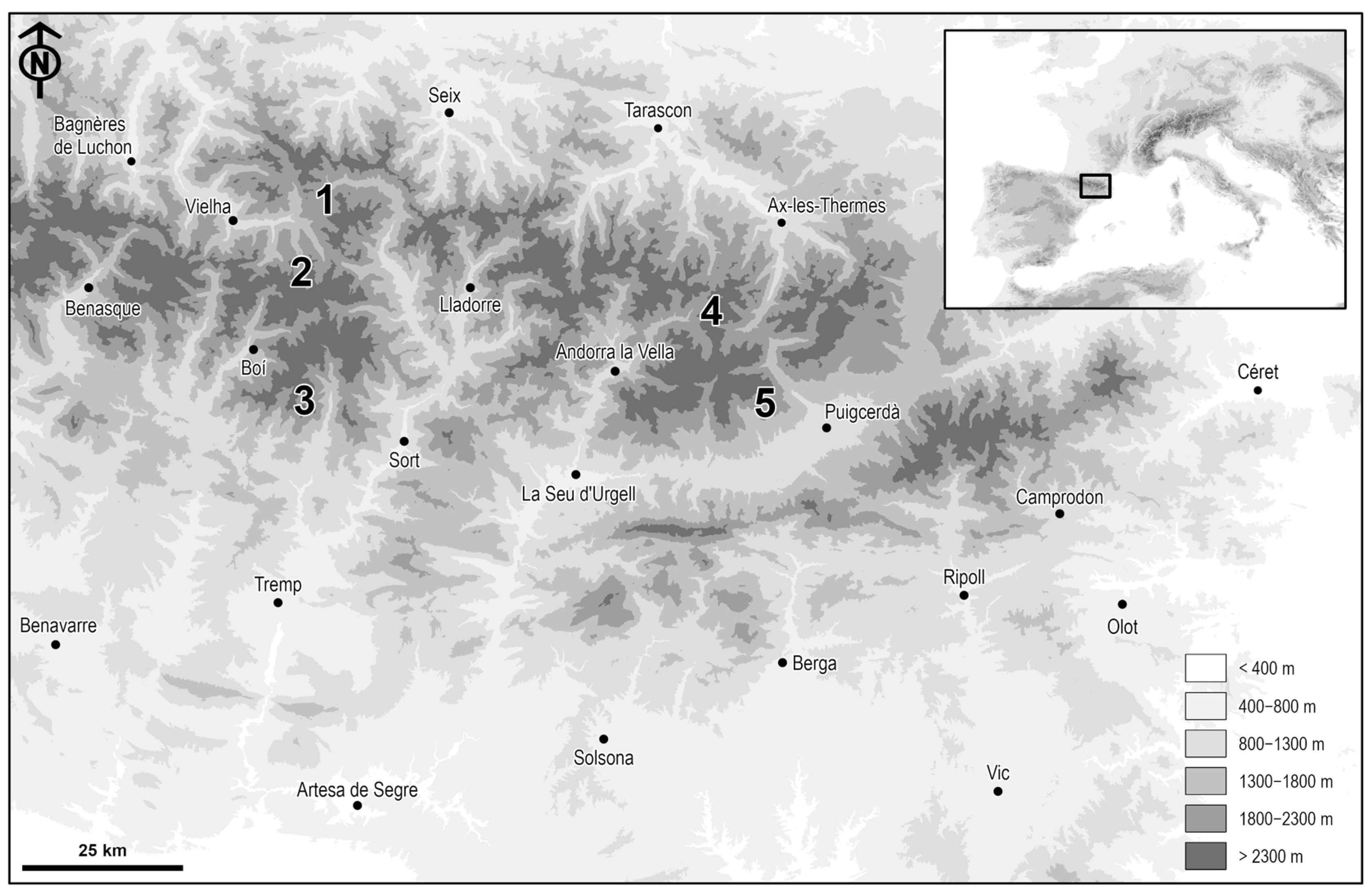 Geographical coordinates (long., lat.) | 0.95358, 42.71462 | 0.92421, 42.63818 | 0.95196, 42.45417 | 1.70454, 42.59528 | 1.79272, 42.47692 |