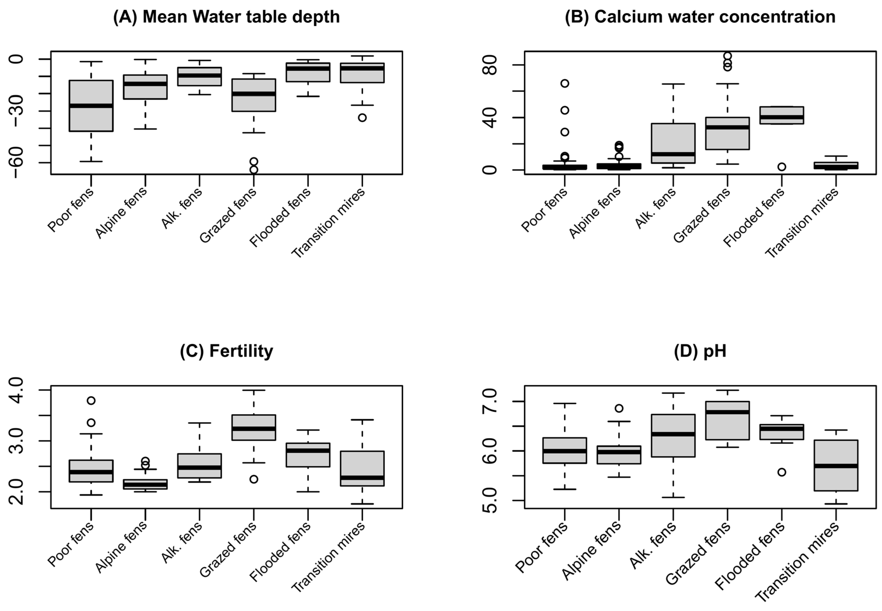 Sphagnum russowii | 1. Poor fens | 0.43 | Phleum alpinum | 4. Grazed fens | 0.56 |