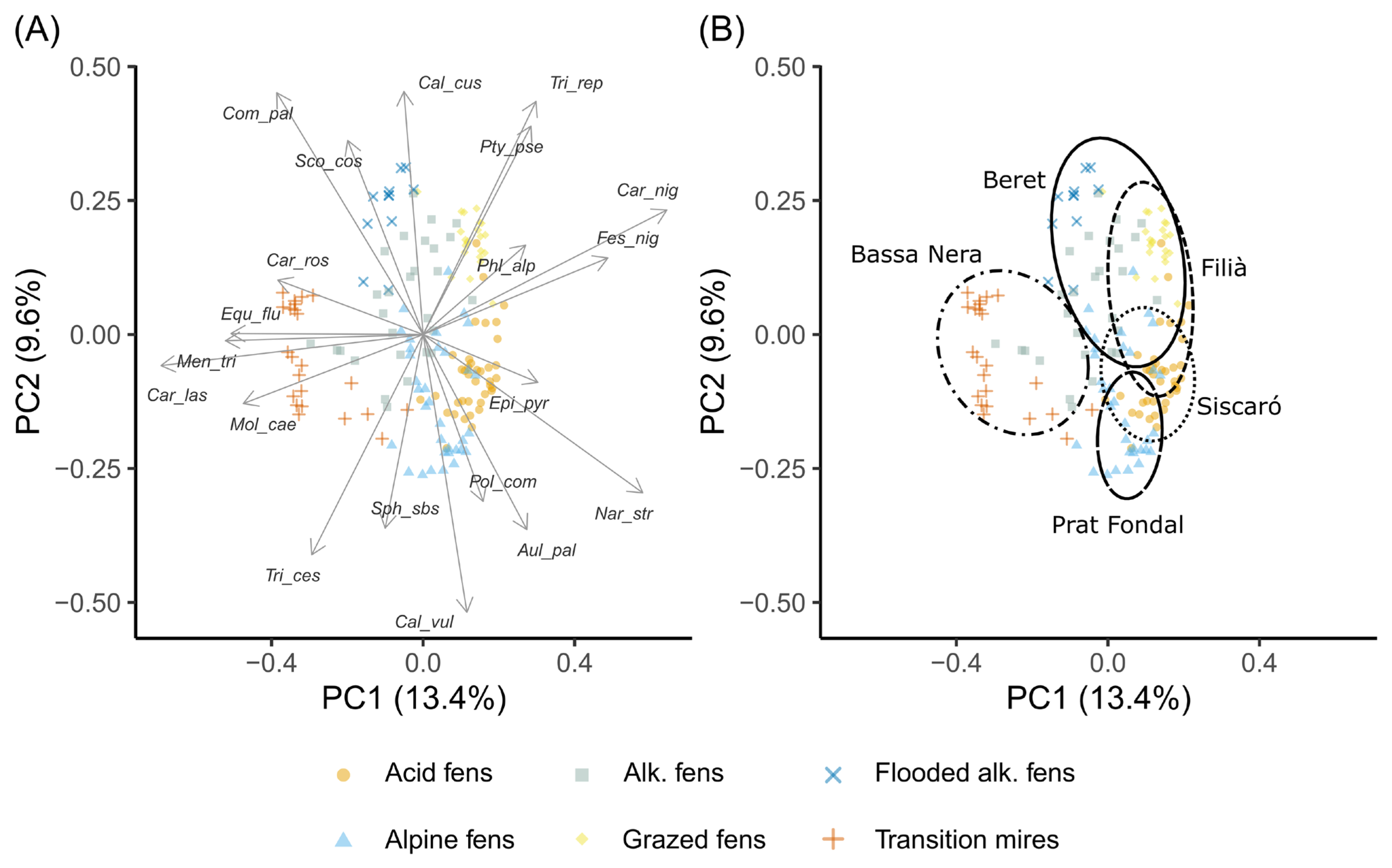 Nardus stricta | 1. Poor fens | 0.63 | Pedicularis pyrenaica | 3. Alk. fens | 0.46 |