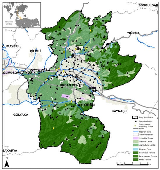 - Düzce İl Çevre ve Orman Müdürlüğü. Düzce Province Environmental Status Report; Ministry of Environment and Urbanization: Ankara, Türkiye, 2009. [Google Scholar]