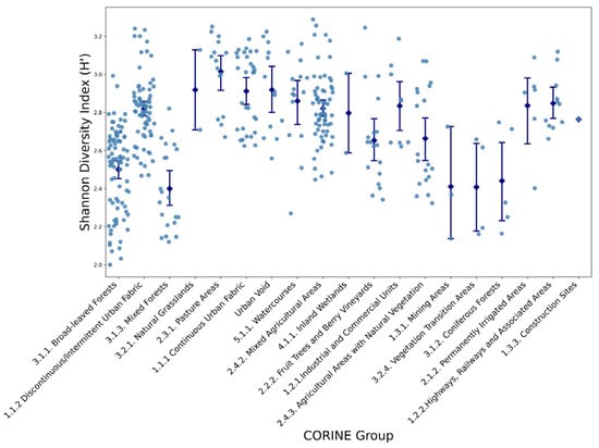 Variations in Shannon Diversity Index (H′) Across Different CORINE Land Cover Groups (see Table 1 for group definitions). Each dot represents an individual sampling site, while blue diamonds and error bars indicate mean values and standard deviations for each CORINE land-cover group.