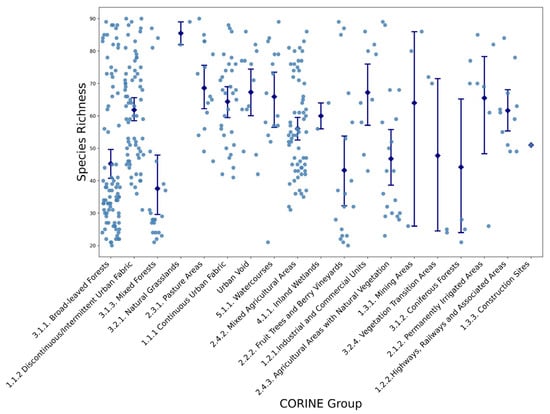 Variations in Species Richness Across Different CORINE Land Cover Groups (see Table 1 for group definitions). Each dot represents an individual sampling site, while blue diamonds and error bars indicate mean values and standard deviations for each CORINE land-cover group.