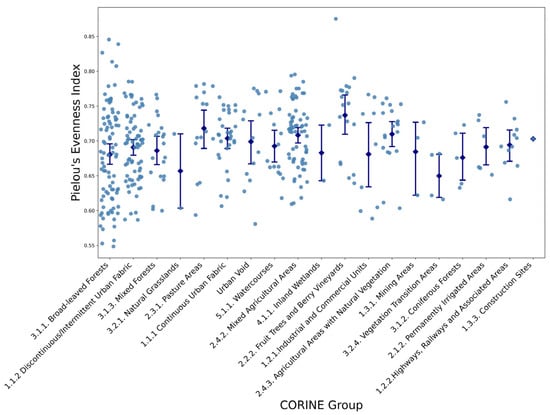 Variations in Pielou’s Evenness Index Across CORINE Land Cover Categories (see Table 1 for group definitions). Each dot represents an individual sampling site, while blue diamonds and error bars indicate mean values and standard deviations for each CORINE land-cover group.