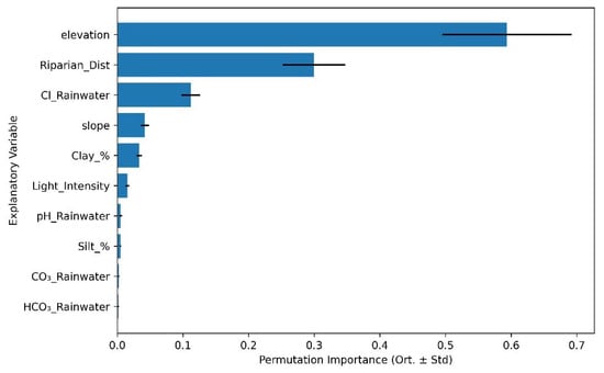 Permutation importance analysis revealed distinct but overlapping sets of environmental drivers for each metric. For Shannon Diversity (Figure 5), the most influential predictors were elevation (importance = 0.594 ± 0.099), distance to water bodies (0.300 ± 0.048), and chloride concentration in rainfall (0.112 ± 0.014), followed by slope (0.042 ± 0.006), percent clay (0.033 ± 0.004), and light availability (0.015 ± 0.003). Minor contributions were observed for pH (0.005 ± 0.002), silt percentage (0.005 ± 0.001), carbonate (CO32−) (0.002 ± 0.001), and bicarbonate (HCO3−) (0.002 ± 0.001).