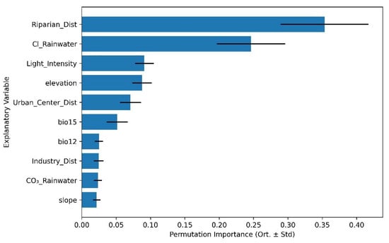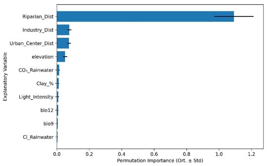 Permutation importance analysis repeated with native taxa-only data produced broadly consistent results. The same top three predictors—elevation, proximity to riparian zones, and chloride concentration in rainfall—retained the highest explanatory power across Shannon diversity, richness, and evenness models. Minor shifts were observed in lower-ranked predictors (e.g., clay %, slope, light intensity), but these did not alter the overall explanatory structure. Detailed ranked importance values are provided in the Supplementary Materials Table S2.