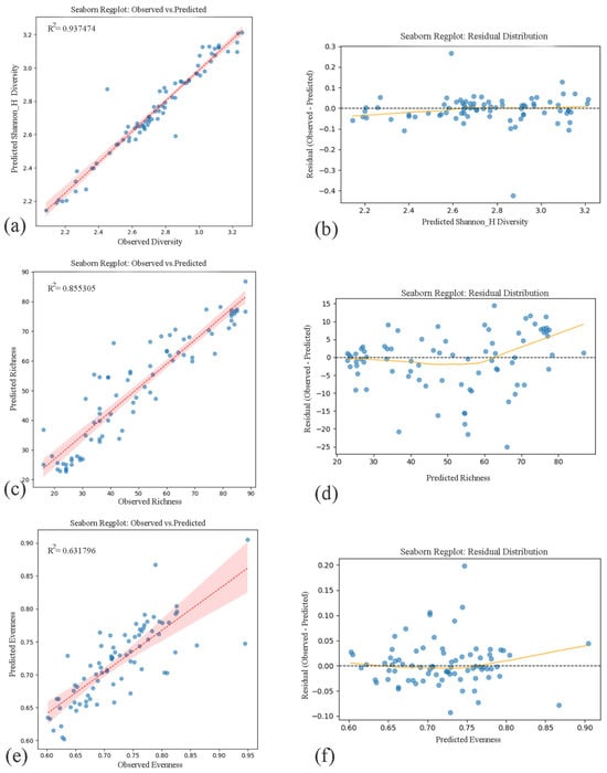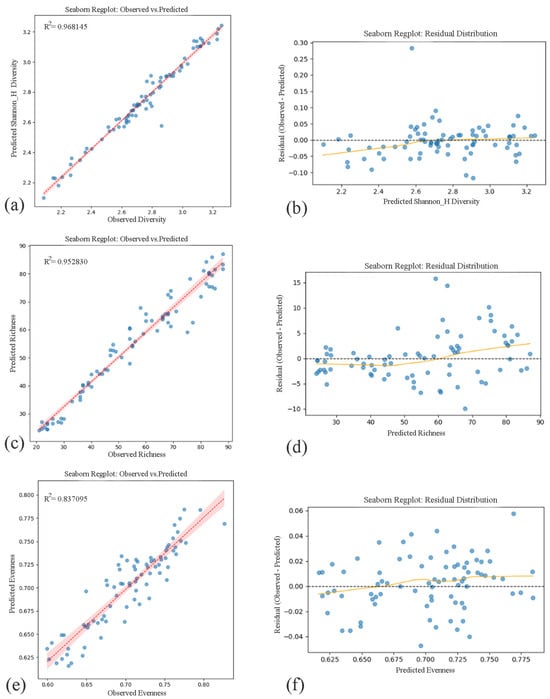 Observed vs. predicted values and residual distributions for Shannon Diversity, Species Richness, and Evenness based on native-only models. (a,b) Shannon Diversity Index predicted by XGBoost regression (R2 = 0.937474); (c,d) Species Richness predicted by Random Forest regression (R2 = 0.855305); and (e,f) Evenness predicted by Random Forest regression (R2 = 0.631796). (The left column shows the model fit between observed and predicted values for (a) Shannon Diversity Index, (c) Species Rich-ness, and (e) Evenness, each accompanied by coefficient of determination (R2). The right column presents residual plots corresponding to each variable—(b,d,f)—demonstrating homoscedasticity and the absence of systematic bias across predicted values, supporting model reliability across urban ecological gradients). Blue dots represent observed vs. predicted values from Random Forest regression models, red lines indicate model fits, and shaded areas represent 95% confidence intervals.