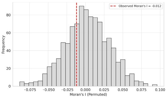 To verify the spatial independence of model residuals, Moran’s I statistic was computed for the RF model predicting Shannon diversity (H′). The test revealed no significant spatial autocorrelation among the residuals (Moran’s I = −0.012, p = 0.302), indicating that the model adequately captured the spatial structure of the predictors and that residuals were randomly distributed within the study area (Figure 10). This suggests that the model results are not biased by spatial clustering effects and can be considered spatially robust.