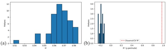 Model Generalizability Diagnostics: (a) 50-fold Hold-out R2 Distribution; (b) Y-shuffle Permutation Test.