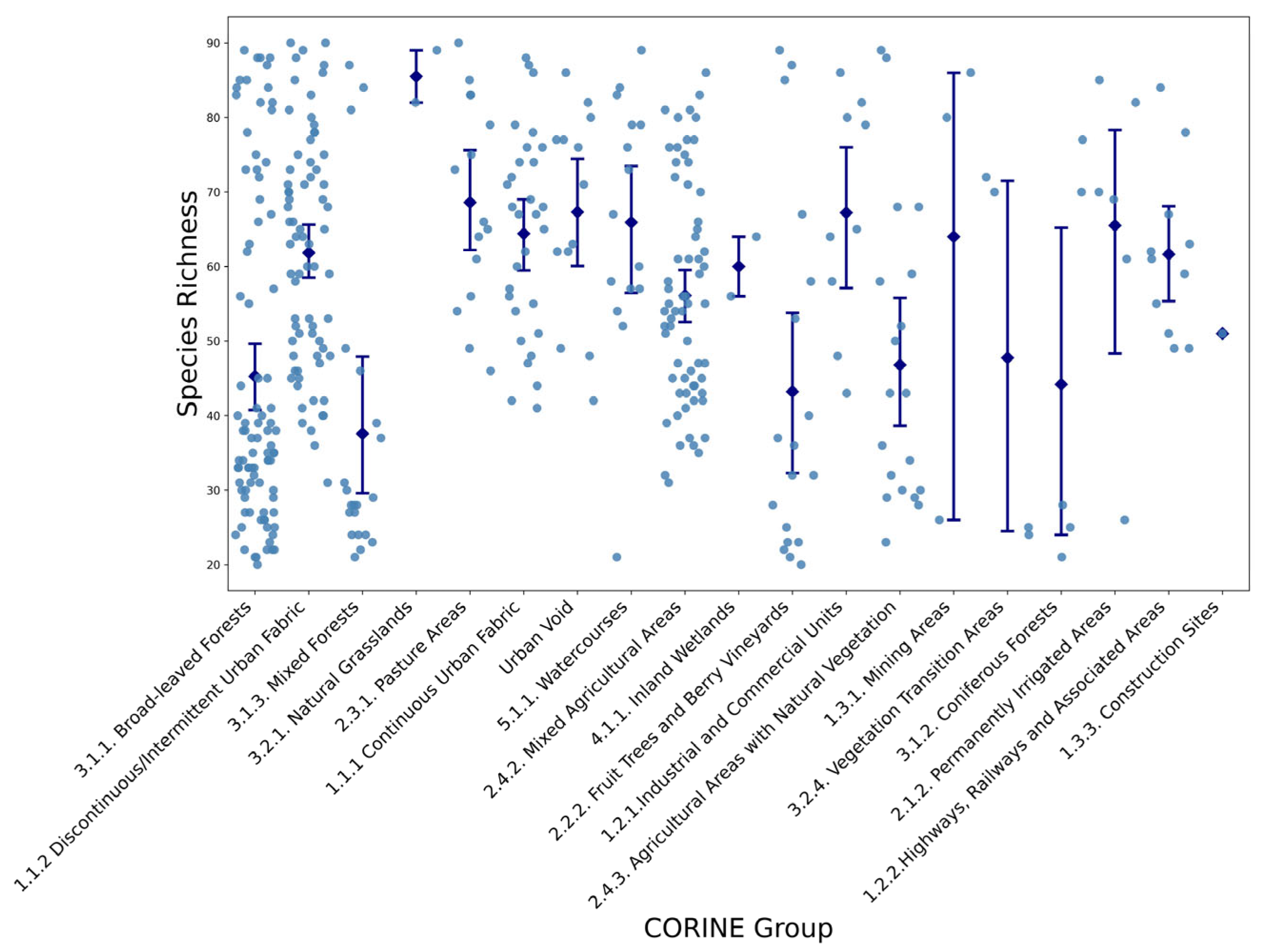 Figure 3. Variations in Species Richness Across Different CORINE Land Cover Groups (see Table 1 for group definitions). Each dot represents an individual sampling site, while blue diamonds and error bars indicate mean values and standard deviations for each CORINE land-cover group.