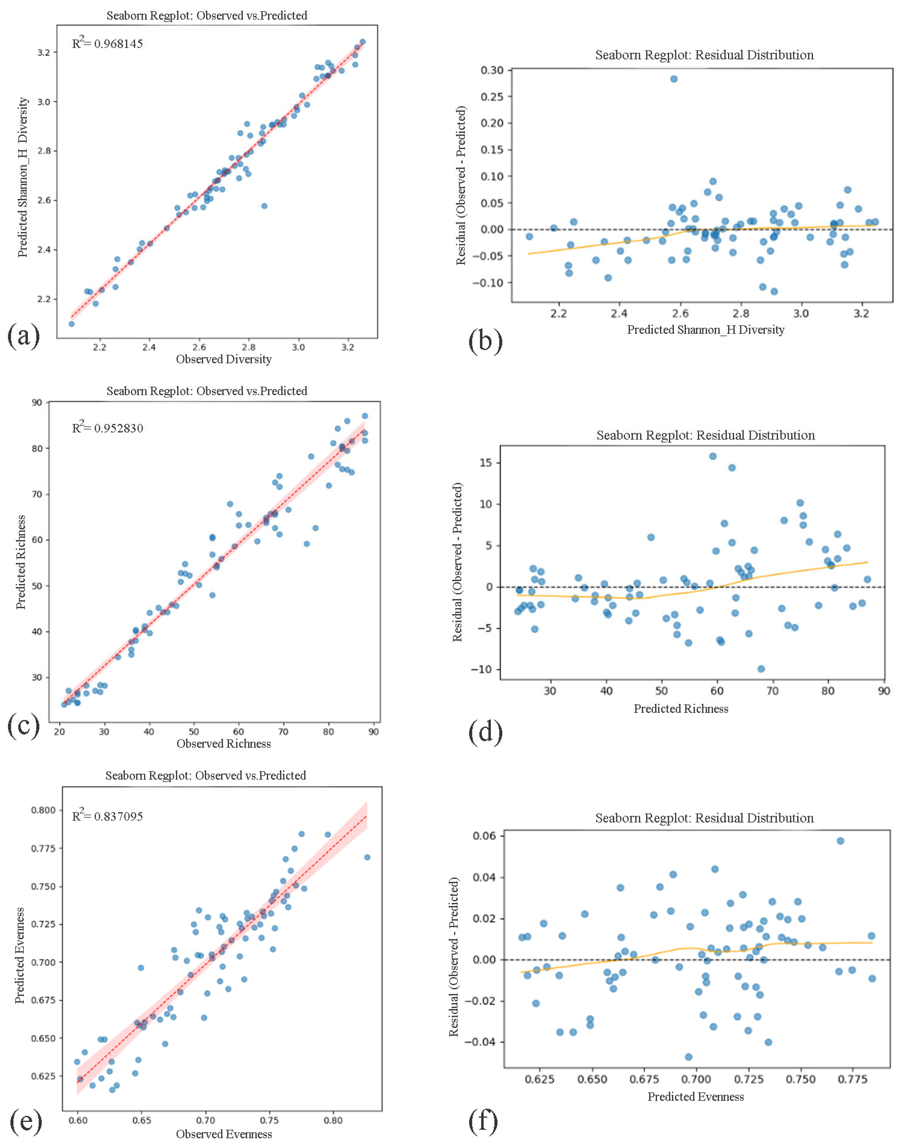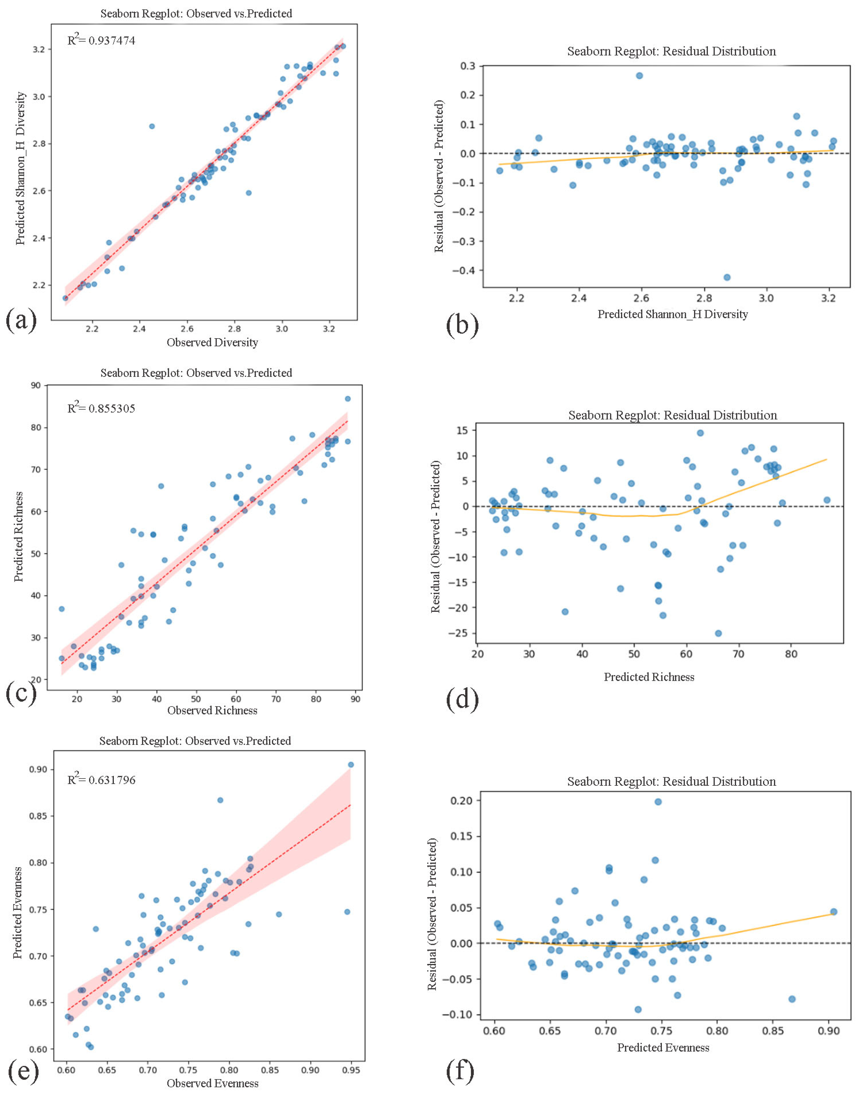 Figure 8. Observed vs. predicted values and residual distributions for Shannon Diversity, Species Richness, and Evenness based on RF regression models. (The left column shows the model fit between observed and predicted values for (a) Shannon Diversity Index, (c) Species Richness, and (e) Evenness, each accompanied by coefficient of determination (R2). The right column presents residual plots corresponding to each variable—(b,d,f)—demonstrating homoscedasticity and the absence of systematic bias across predicted values, supporting model reliability across urban ecological gradients). Blue dots represent observed vs. predicted values from Random Forest regression models, red lines indicate model fits, and shaded areas represent 95% confidence intervals.