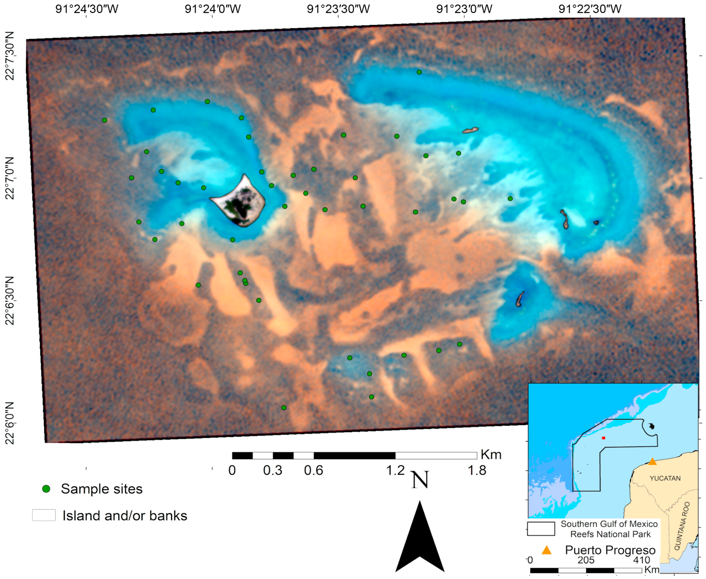- Busby, R.F. Sediments and Reef Corals of Cayo Arenas, Campeche Bank, Yucatán, Mexico; US Naval Oceanographic Office: Hancock, MS, USA, 1965; Volume 187. [Google Scholar]