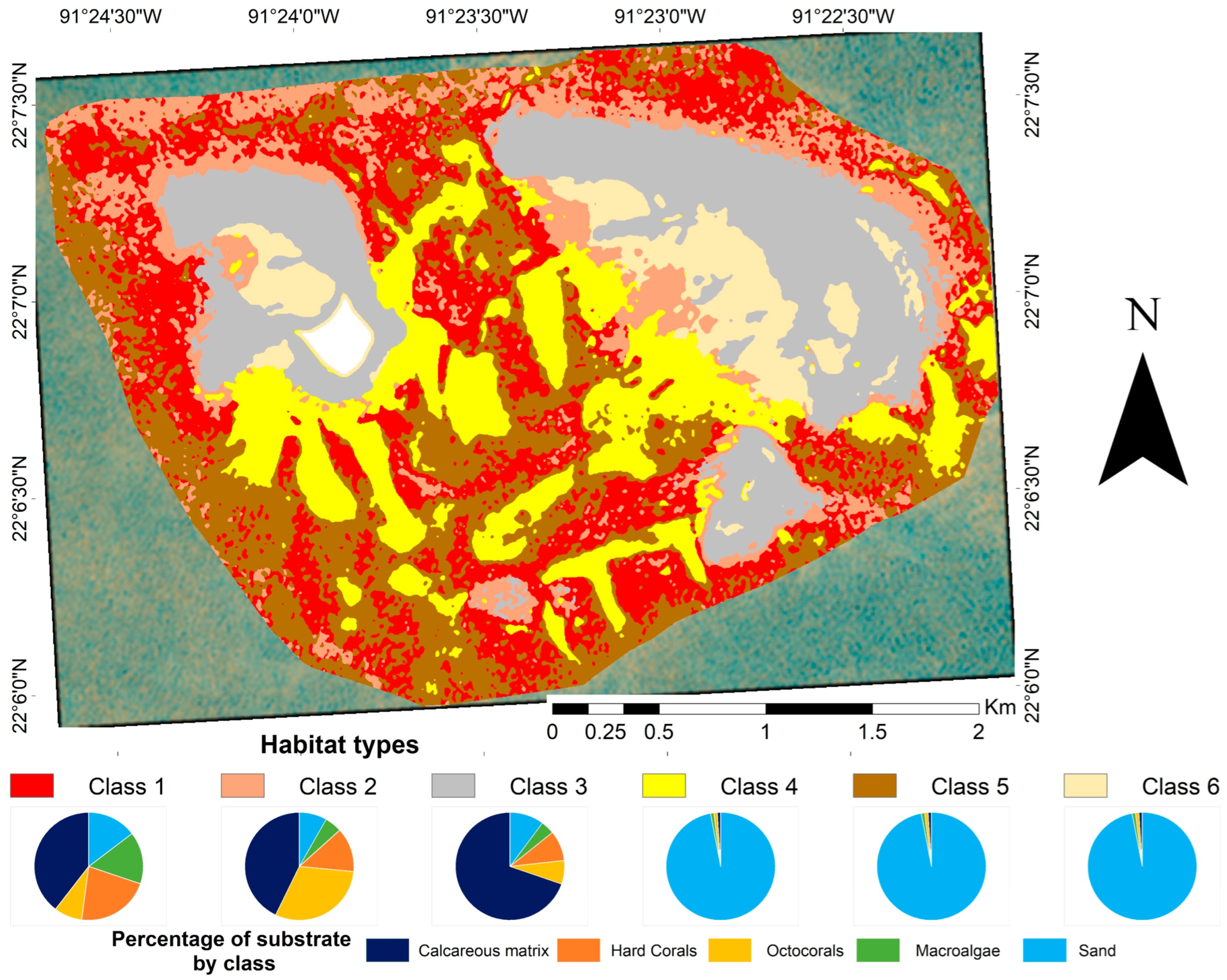 | One | Moderate hard corals coverage with other components | This class exhibits a low to high coverage of calcareous matrix and hard coral cover, with a low coverage of octocorals, sand, and macroalgae. Located in deeper zones. |