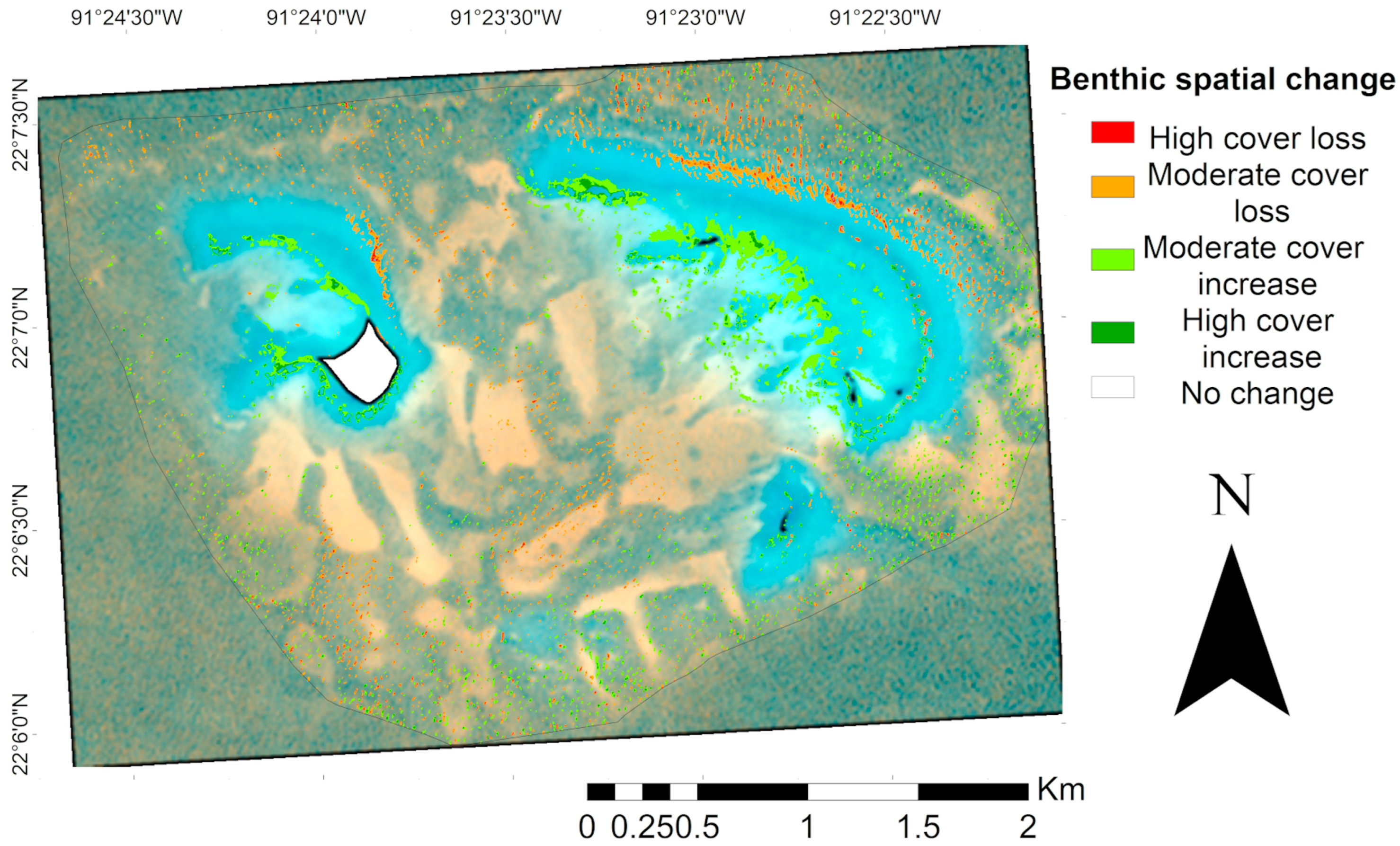 - Andréfouët, S.; Muller-Karger, F.E.; Hochberg, E.J.; Hu, C.; Carder, K.L. Change Detection in Shallow Coral Reef Environments Using Landsat 7 ETM+ Data. Remote Sens. Environ. 2001, 78, 150–162. [Google Scholar] [CrossRef]