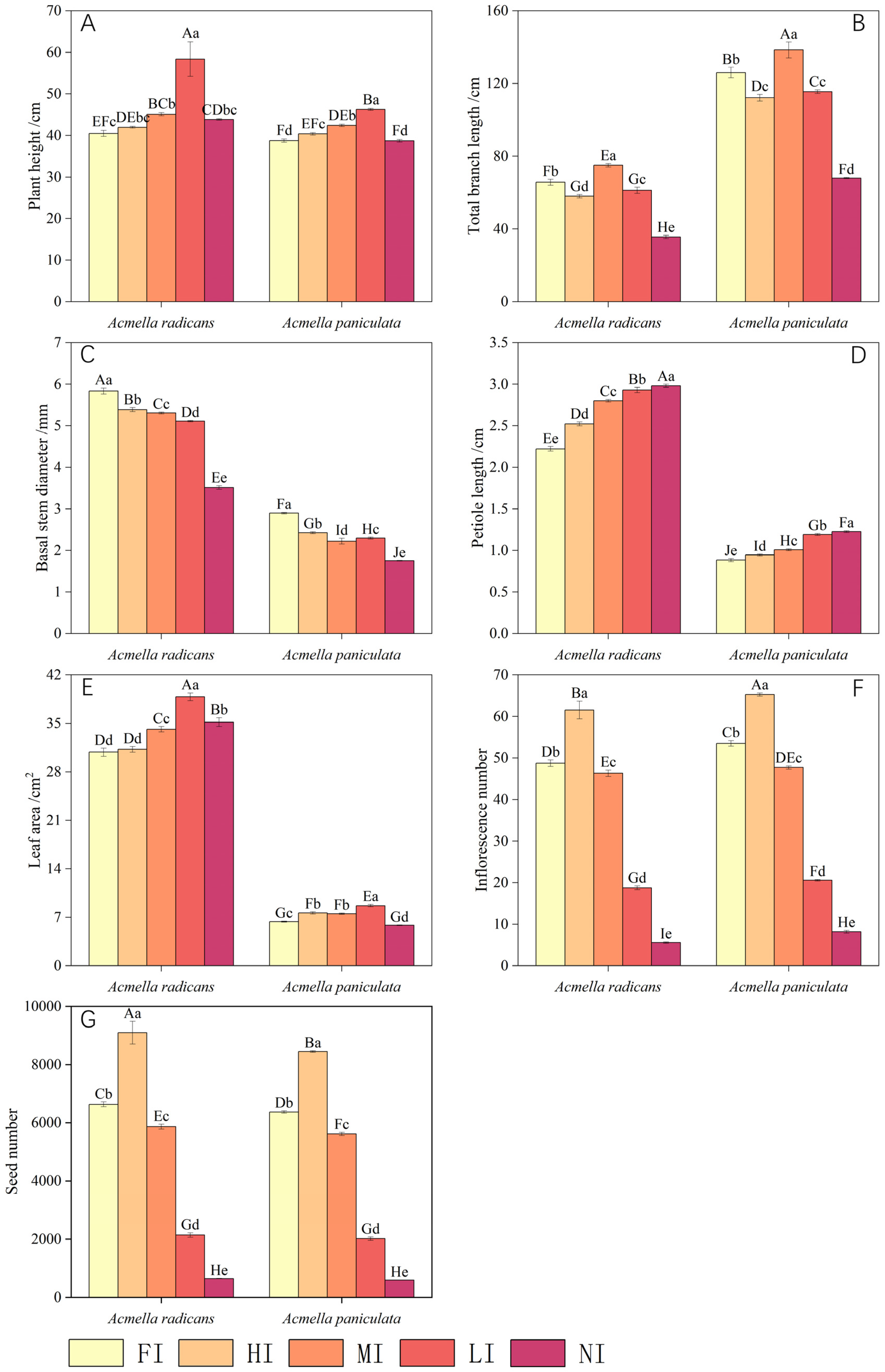 Figure 1. Plant growth and reproductive characteristics of Acmella radicans and Acmella paniculata under different light levels [FI = full irradiance (100%), HI = high irradiance (75%), MI = moderate irradiance (50%), LI = low irradiance (25%), NI = non irradiance (5%)] for (A) plant height, (B) total branch length, (C) basal stem diameter, (D) petiole length, (E) leaf area, (F) inflorescence number, and (G) seed number. Different small and capital letters above bars indicate a significant difference at 0.05 level for one species and between two species under different treatments, respectively.